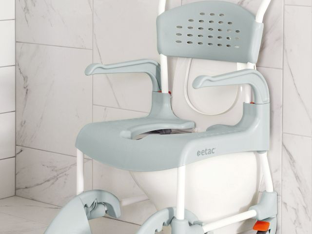 A cadeira sanitária inclui apoios para os braços forrados e confortáveis e é regulável em altura, o que a torna uma cadeira sanitária portátil ideal para todas as alturas.