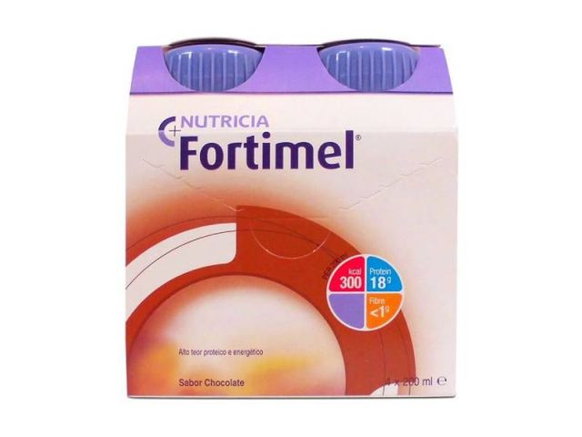 Fortimel Solução Chocolate 4x200ml suplemento nutricional oral hipercalórico e hiperproteico. Especialmente formulado com uma mistura única de 4 proteínas (soroproteína, caseína, ervilha e soja).